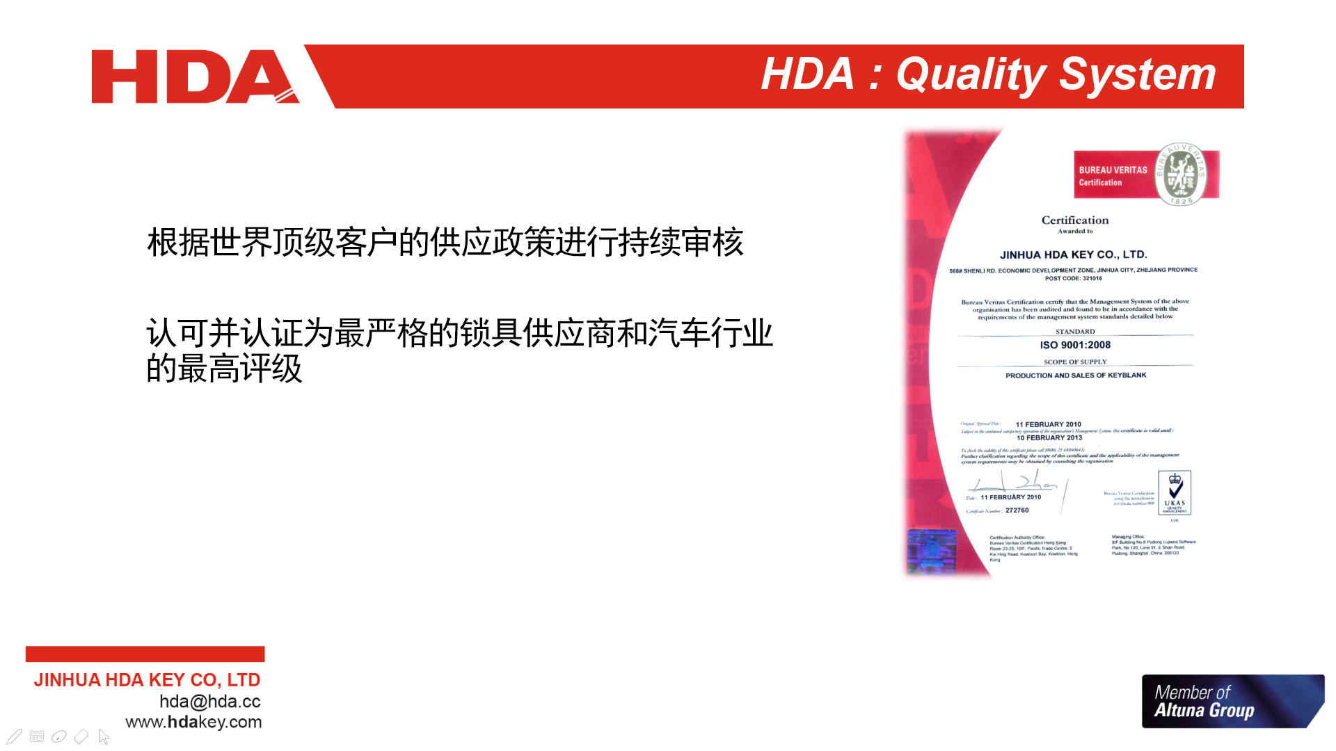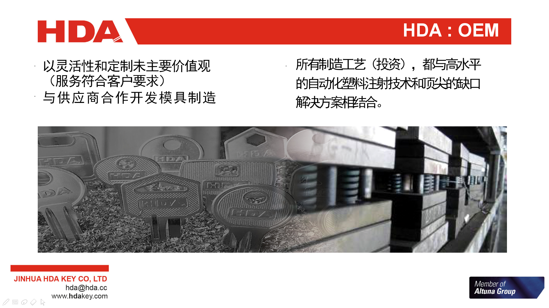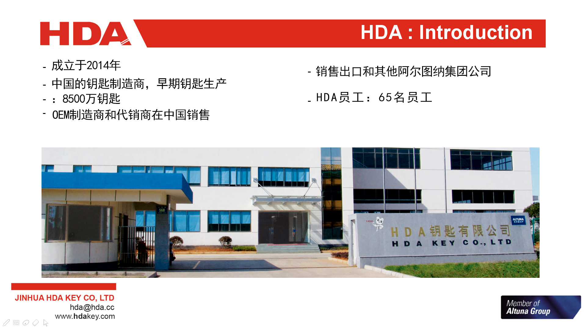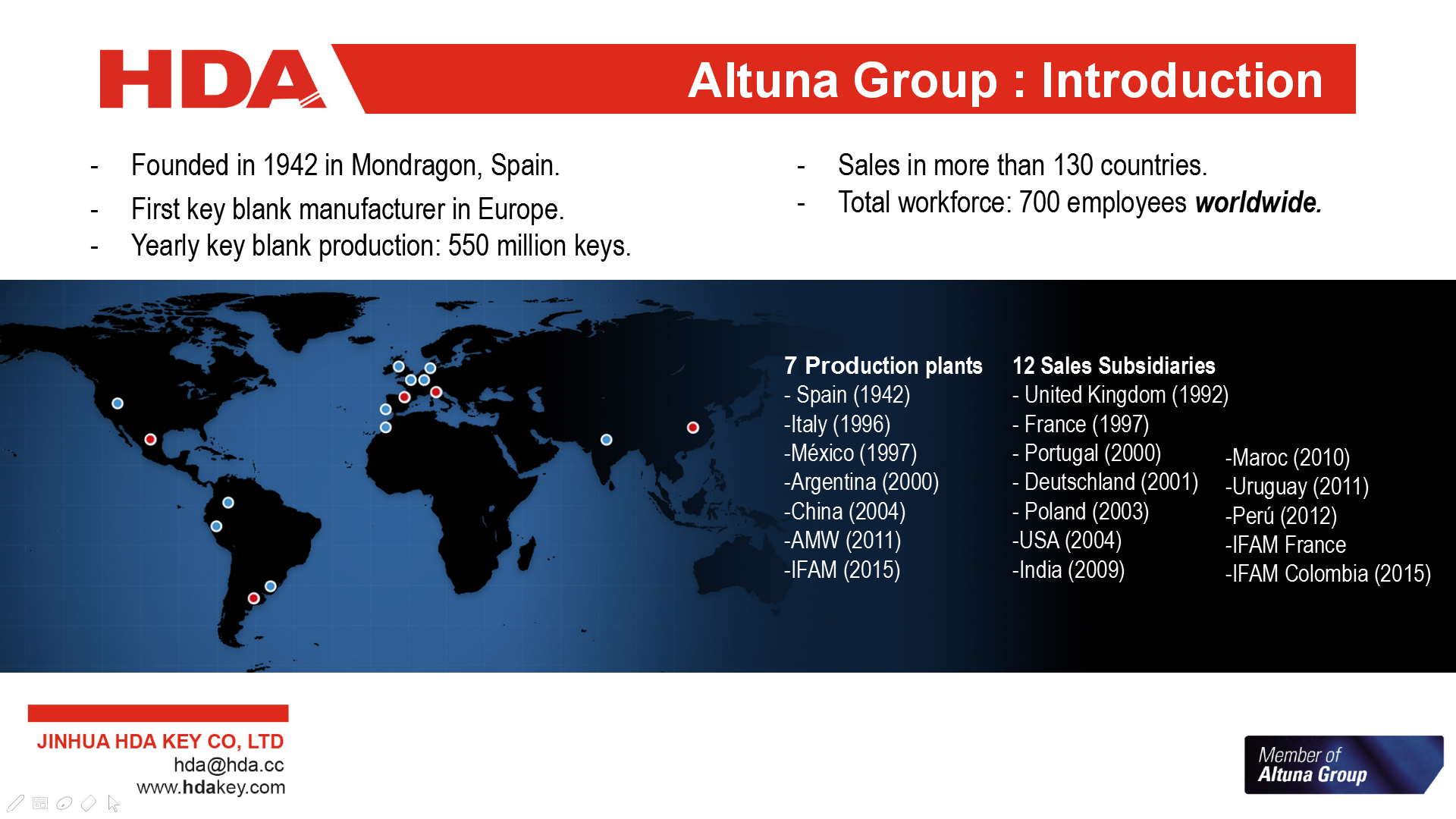 2005年,與歐洲三大鑰匙坯生產(chǎn)企業(yè)之一的西班牙JMA集團(tuán)成立合資公司--金華HDA鑰匙有限公司。 2007年,轉(zhuǎn)為西班牙JMA集團(tuán)獨(dú)資子公司。